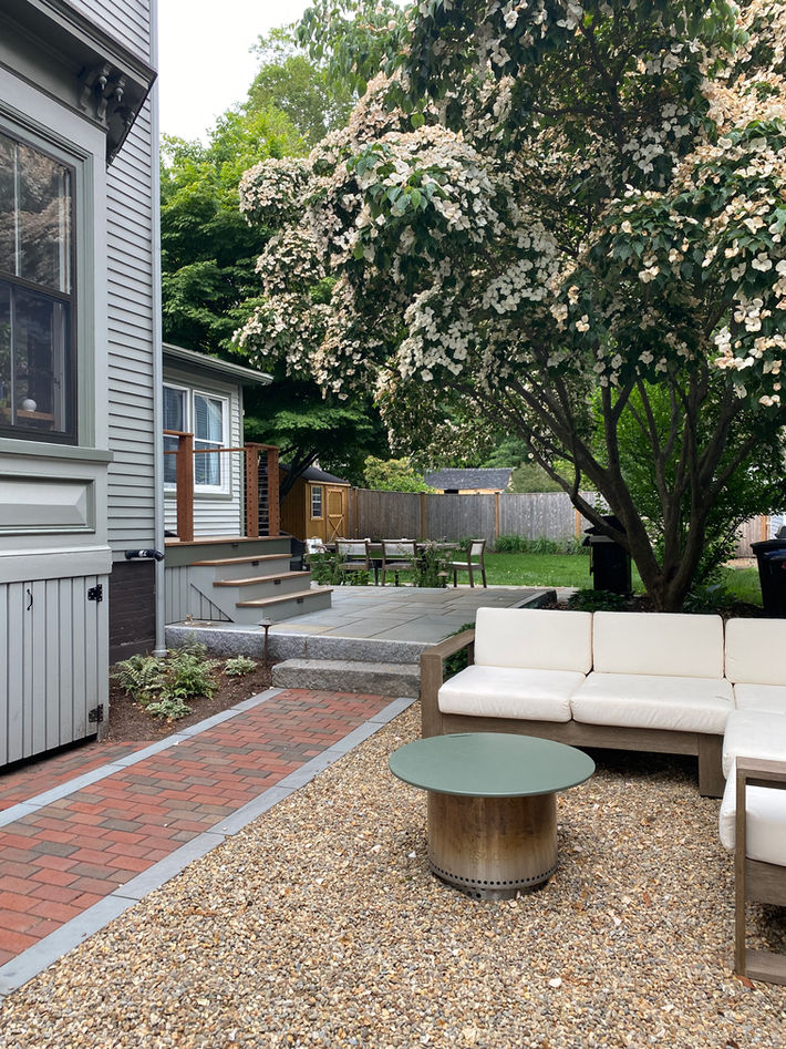 This re-invented outdoor living space in the heart of Portsmouth's South End added a cozy fire pit area that doubles as an extra parking space, making it perfect for town living. The re-used brick path guides you through distinct tiers creating inviting spots for conversation, enjoying company, and dining. The custom mahogany deck adds a stunning touch, perfectly complementing the dining room door and the charm of this historic house.
