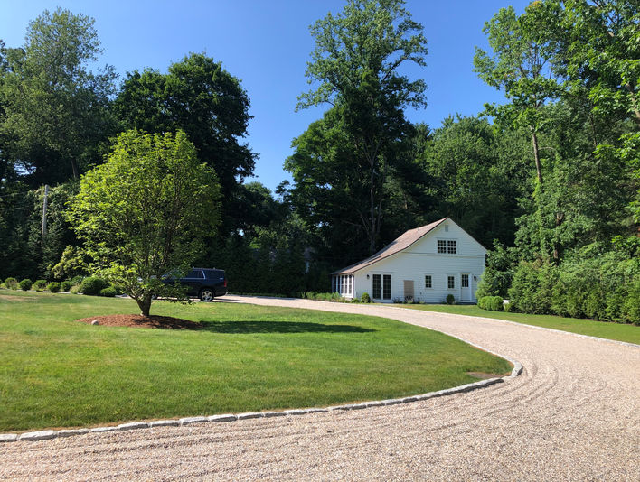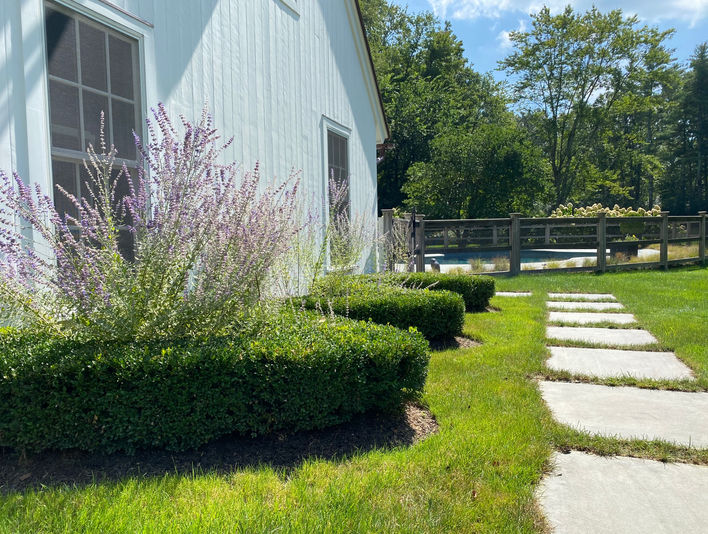 This historic estate in backcountry Greenwich went through a landscape transformation. Modern blustone paths and an updated pool deck were added. The gardens use a lot of structure with perennials in shades of purple, green and white.